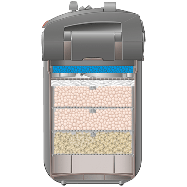 Eheim Pro 5e har en stor filterbeholder med et imponerende filtervolum, som gir utmerket ytelse og lengre driftstider mellom vedlikehold. Forfilteret er plassert direkte under pumpehodet, noe som gjør det enkelt å rengjøre uten å forstyrre det følsomme biofiltermaterialet. -