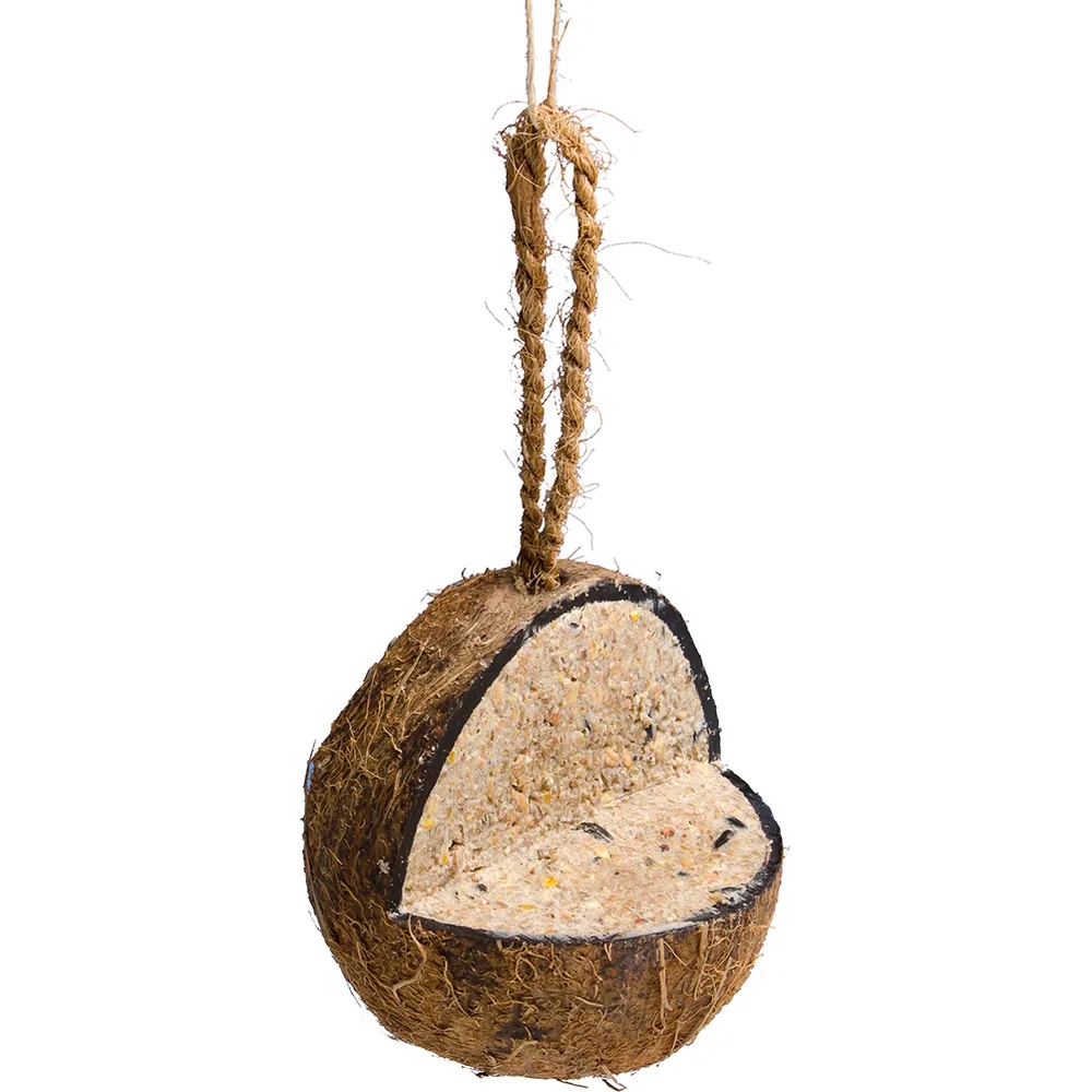 Kokosnøtten er uthult og fylt med en smakfull blanding av talg og frø som gir villfuglene høyt energiinnhold gjennom hele den kalde sesongen. Den integrerte plattformen fungerer som sitteplass, slik at både små og mellomstore fugler enkelt får tilgang til maten. Produktet leveres med opphengssnor, slik at du raskt kan henge det i et tre, på en krok eller ved fuglebrettet.