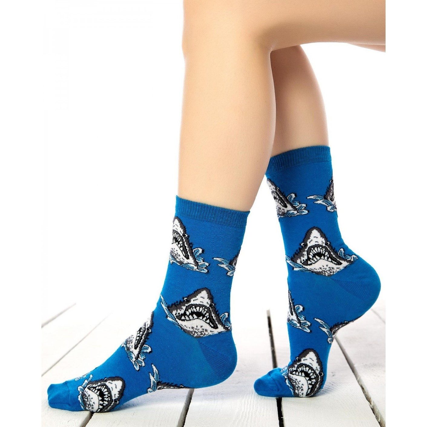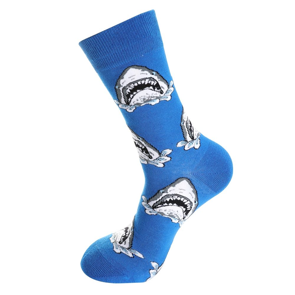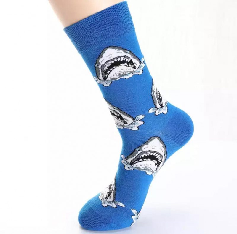 Blå sokk med hai som viser tennene.