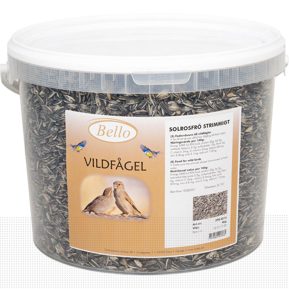 Stripete solsikkefrø til villfugl i praktisk 4 kg bøtte. Hele, energirike frø som er favoritt hos småfuglene og passer perfekt i fôrautomat.