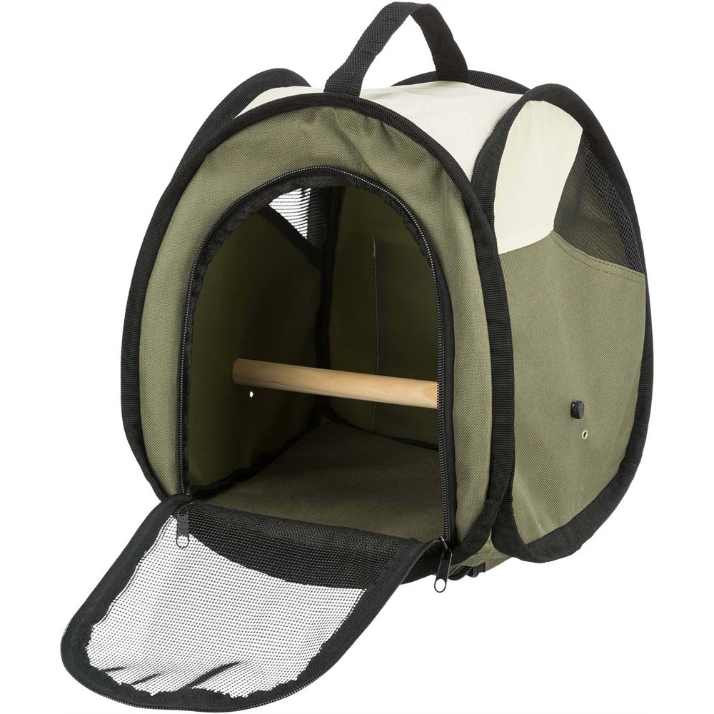 Ideell for transport av fuglen f.eks. til veterinæren. Avtakbar trepinne med robust skruesystem. Nettinnsats sikrer god lufttilførsel. Med sidelommer. Sammenleggbar og plassbesparende. Avtakbar bunnplate