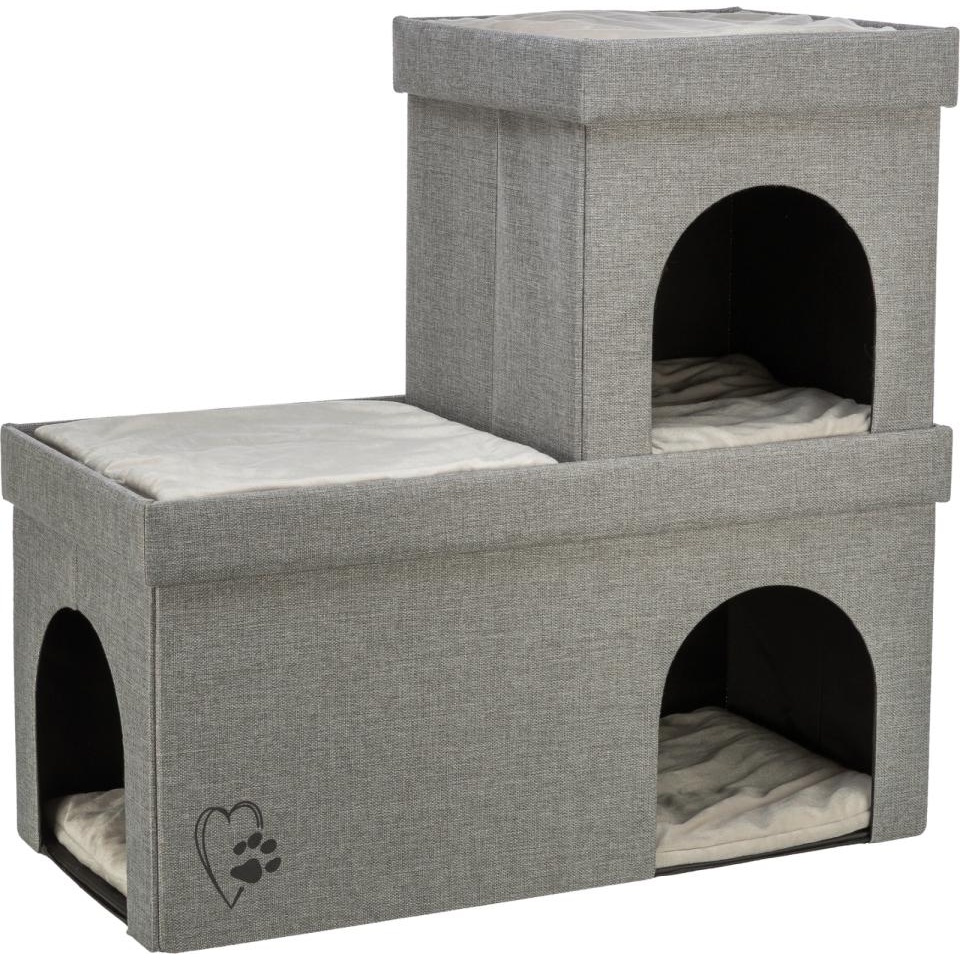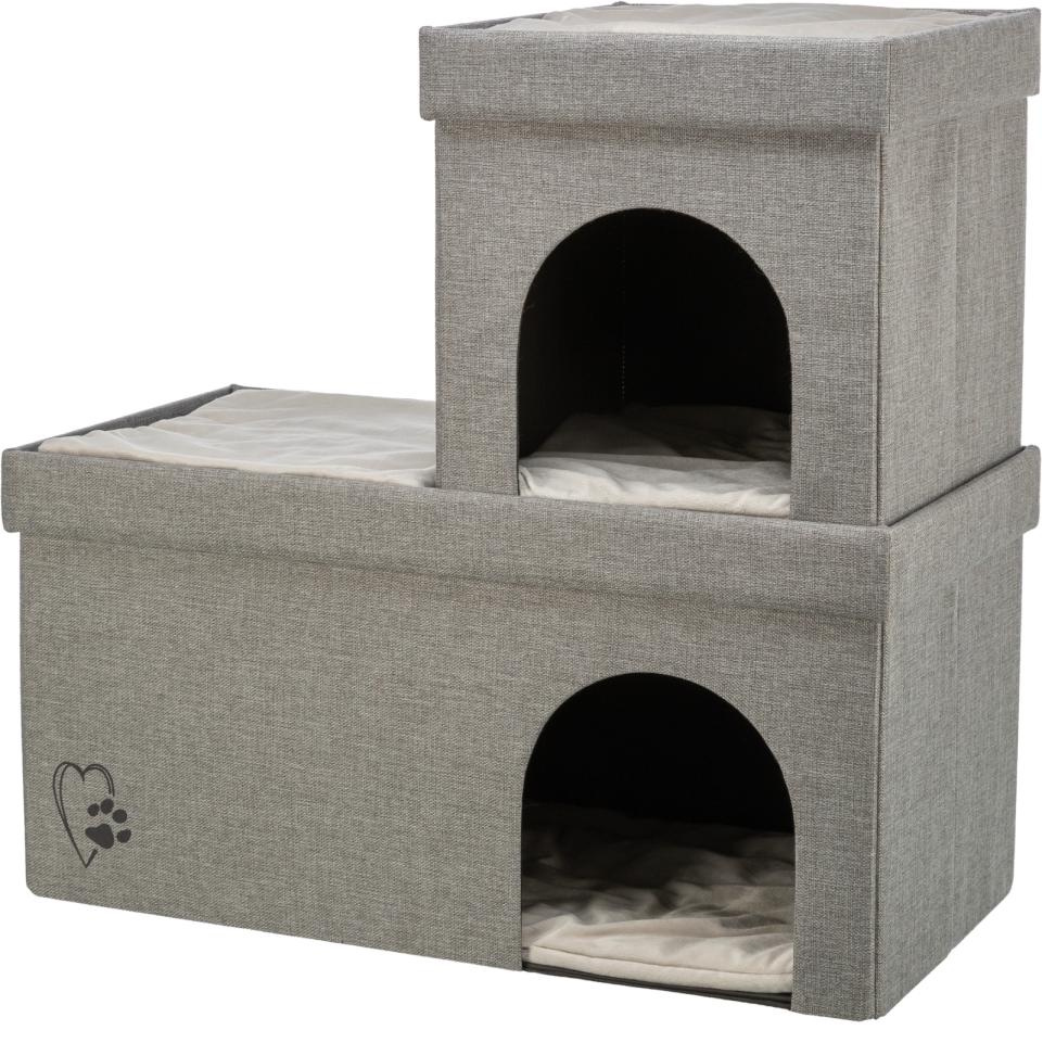 Trixie Kimi hule 2 etager – dobbel katteseng med åpninger for lek og hvile. Myk polstring, stabil ramme, lysegrå design. Romslig for klatring og kos!