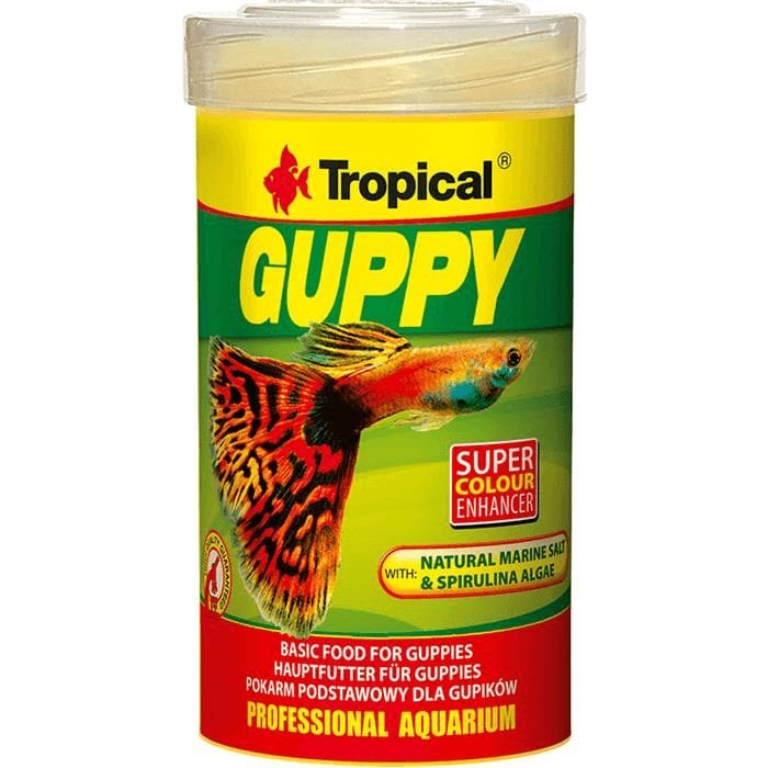 Tropical Guppy Super Color er spesielt utviklet for vivipare fisk som guppies, mollys og platys. Fôret inneholder naturlig havsalt som positivt påvirker elektrolyttnivåer og osmotisk trykk, hvilket er avgjørende for graviditet og overlevelse av yngel. I tillegg inneholder det en kombinasjon av spirulina og ufordøyelige fibre som fremmer en sunn fordøyelse og forhindrer forstoppelse.