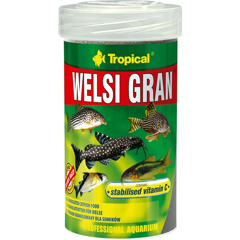 Tropical Welsi Gran er et høykvalitets, komplett og multi-ingrediensfôr utviklet spesielt for akvariefisk som trives og spiser nær bunnen. Fôret kommer i form av synkende granulat som raskt mykner i vannet takket være en skånsom og avansert produksjonsprosess. Dette gjør fôret lett å akseptere og spise, samtidig som det reduserer risikoen for at mat blir liggende urørt og forurenser vannet.